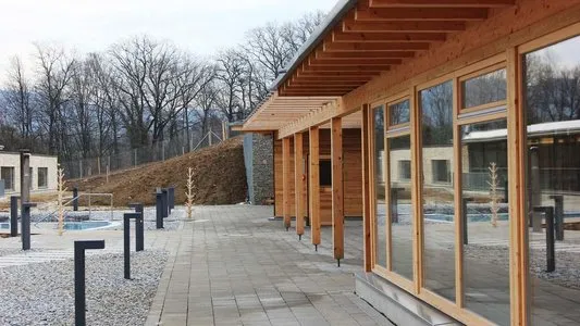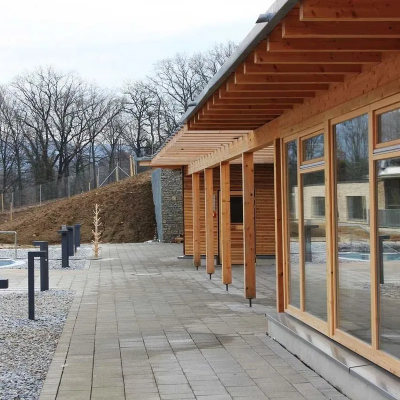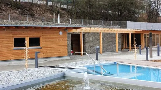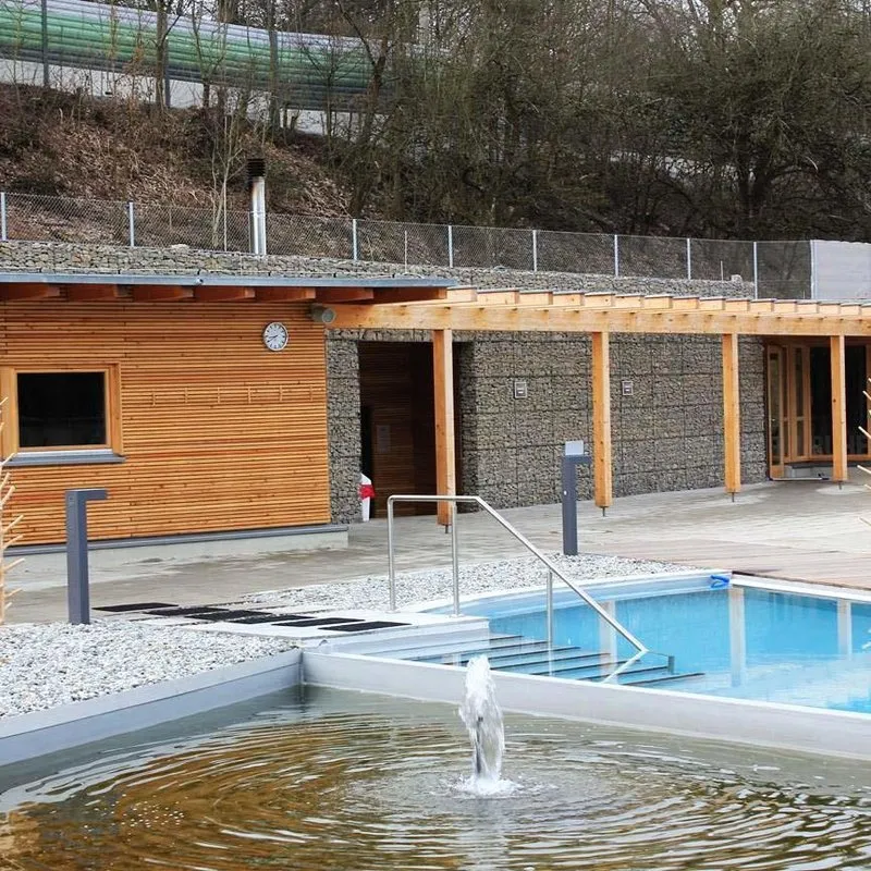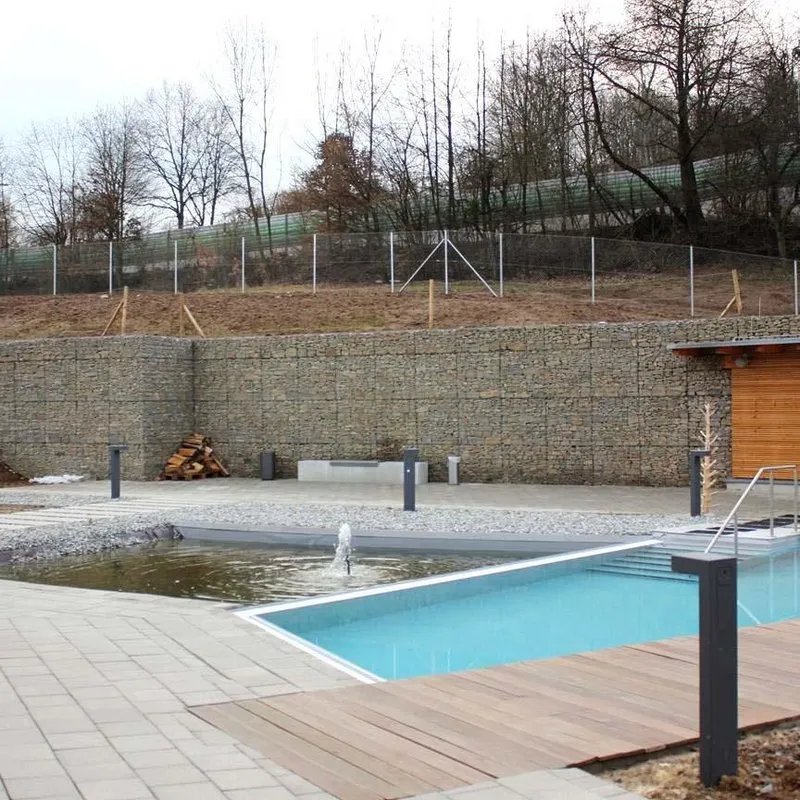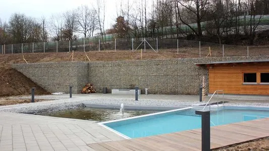 Bei dem Projekt „Backnang“ handelt es sich um eine Freizeitanlage mit Schwimmbad. Aufgrund der Anforderung des Auftraggebers wurde hier mit C-Klammern gearbeitet. Erstellt wurden hier eine Wandverkleidung an der Saunalandschaft, sowie Böschungssicherung neben dieser, gestalterische Merkmale auf den Dächern der Sauna, als auch eine Böschungssicherung an den Schwimmbadbereichen.