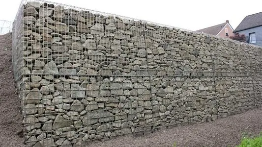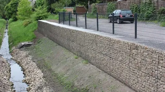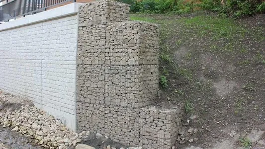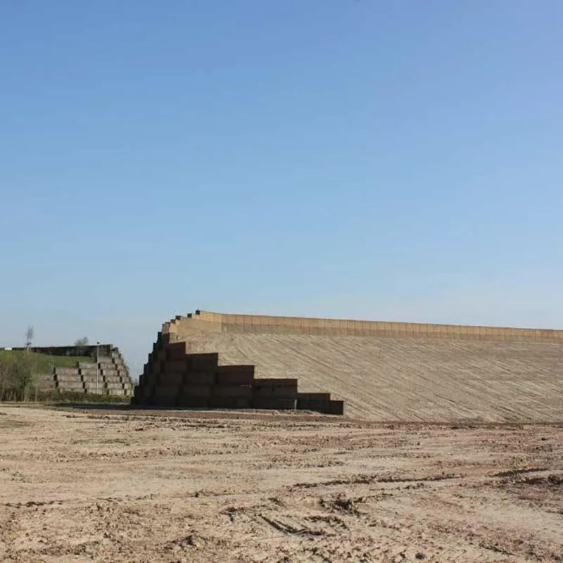 Diese Gabionenwand wurde im Raum Köln zur Sicherung der Böschung eines Hubschrauberlandeplatzes gebaut.