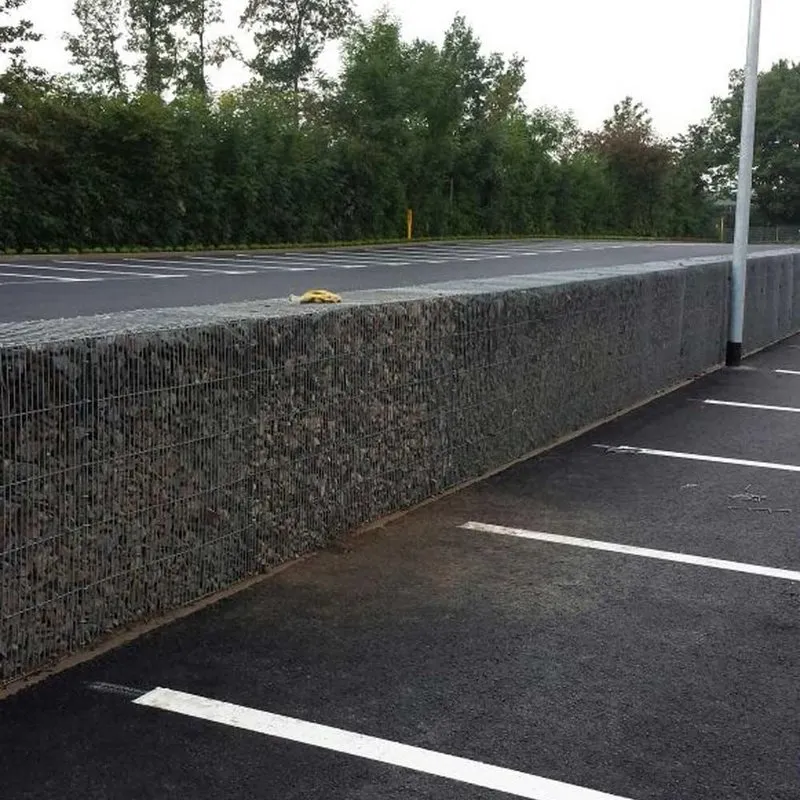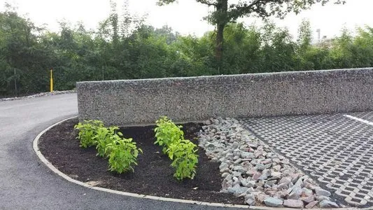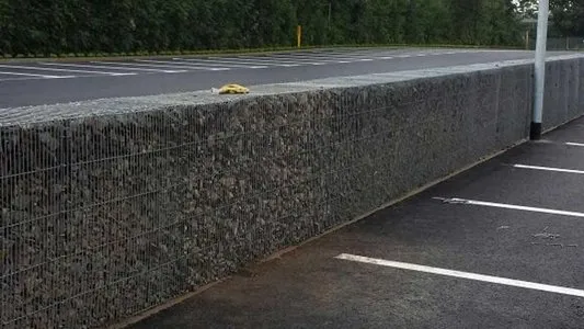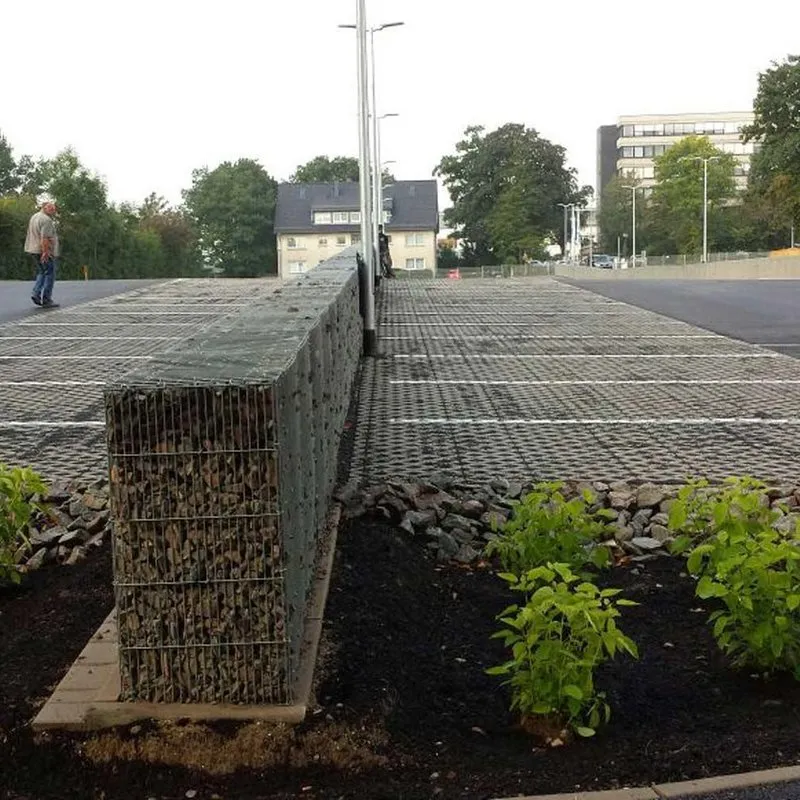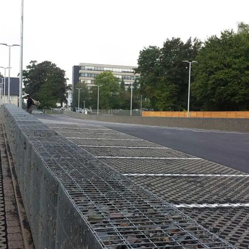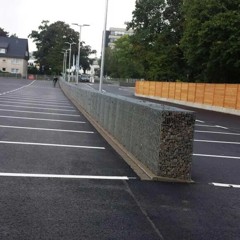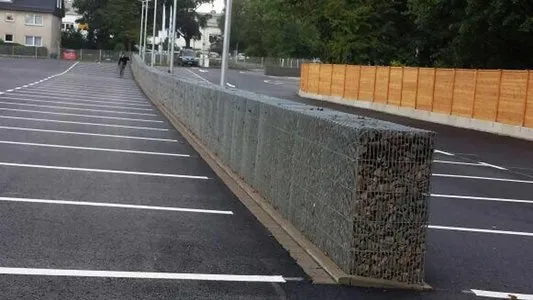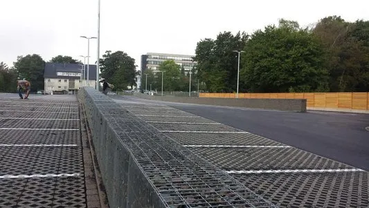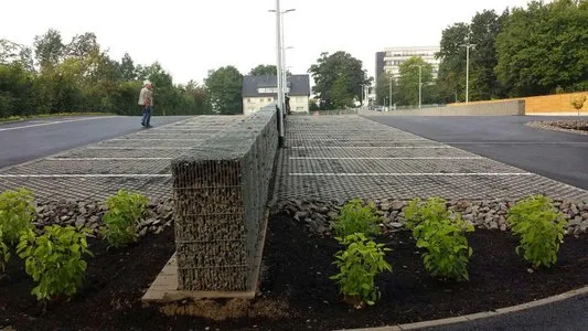 Um den dadurch entstehenden Lärm zu vermindern, wurde eine reflektionsmindernde 1m Hohe Gabione zwischen den Parkstreifen angelegt.